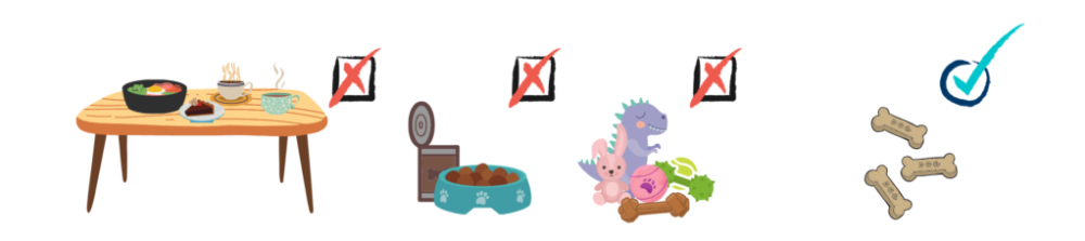 Schovejte všechny hračky a dobrůtky (např. žvýkací kosti, parůžky), které běžně leží na zemi. Můžou se stát předmětem sporu, když si je bude chtít nový pes vzít a domácí pes si je bude bránit. Odstraňte misku, ze které domácí pes jí a nechte k dispozici jenom misku s vodou. Odstraňte i vaše jídlo položené na stolech nebo na kuchyňské lince.