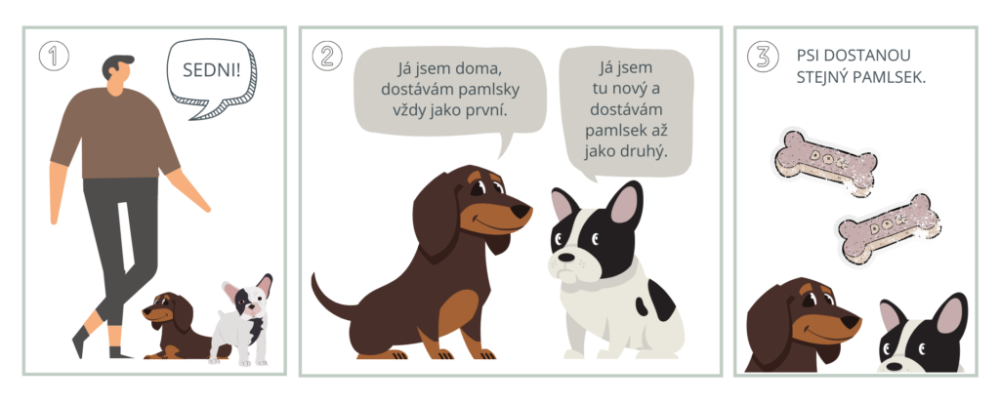 Domácí pes vidí, že vnímáte hierarchii správně a potvrzujete mu jeho pozici. Domácí pes je v hierarchii pod vámi (vy dáváte pamlsky a rozhodujete o nich), ale zároveň se nachází nad novým psem (proto dostane pamlsek jako první).