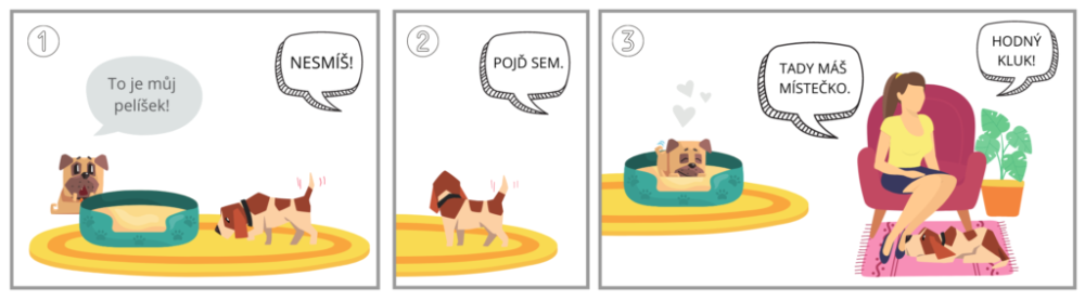 PŘÍKLAD: Váš pes se chystá lehnout si do pelíšku druhého psa. Má vykročeno směrem k pelíšku, když si ho všimnete. Zastavte ho, napomeňte ho a ukažte mu, které místo je pro něj vhodnější. Pokud vás poslechne, pochvalte ho.