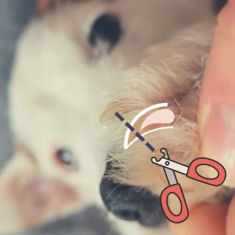 Přerostlý drápek poznáte dle toho, že je zatočený a ostrý. U světlých drápků vidíte růžové lůžko a pak dlouhý světlý „prázdný“ drápek. Stříhejte kousek za lůžkem. Drápky udržujeme pravidelným stříháním krátké, aby nepřekážely při chůzi. Pokud drápky pravidelně nezkracujete, lůžko proroste až do záhybu a nejde zkrátit.
